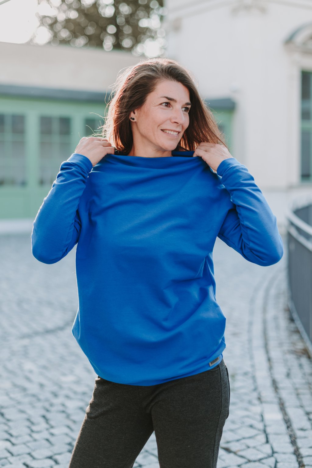 Tato dámská mikina má rafinovaně spadlá ramena, ale zúžené rukávy, aby byly hezky ženské.