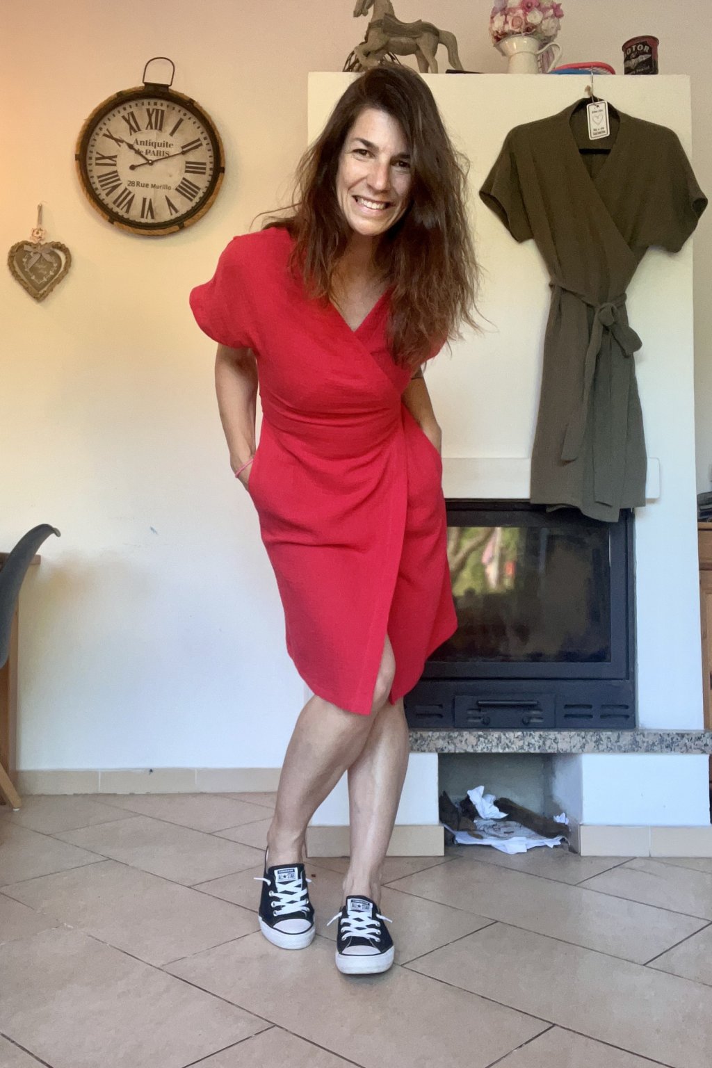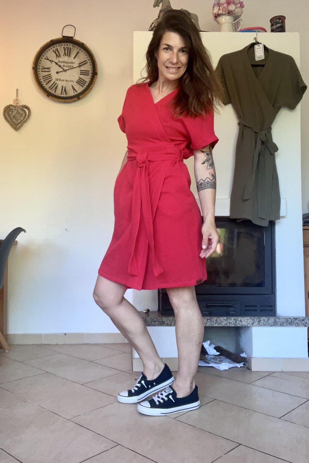 Úžasně pohodlné zavinovací mušelinové šaty s kapsami volnějšího střihu, pásek si můžete zavázat vepředu, ale i za zády a vytvořit si zase úplně jiný dyzajn.